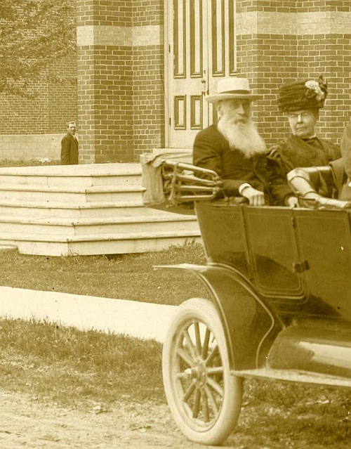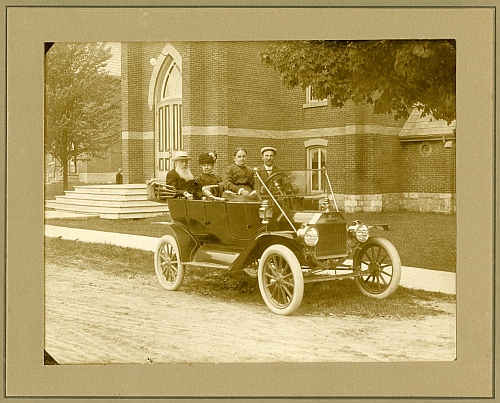 The building in both of these photographs is the Methodist Church in Stirling, now St. Paul's United Church. The younger couple in the front of the car are probably the Badgleys' son, William Ward Badgley (1868-1929) and his wife Sarah (born Stiles, 1866-1958).