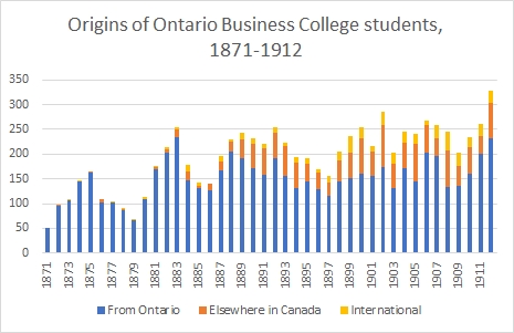 One of the striking things about these records is the wide area from which the college drew its clients. The majority of students (77%) were from Ontario, but a significant proportion (17%) were from elsewhere in Canada, and 6% of the students between 1871 and 1912 were from other countries. Some were from the United States, but many came from Bermuda, Barbados, Jamaica and Guyana (then called British Guiana).