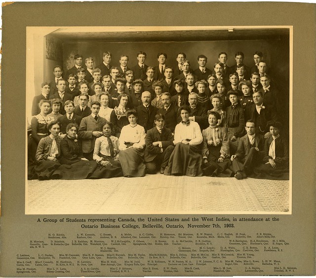 The Ontario Business College was clearly proud of the wide geographic range it served: overseas and non-Ontario locations in the registers are underlined in red and photographs featuring out-of-province students were taken. The Salomon sisters were captured in one such college photograph of a group of students from “Canada, the United States and the West Indies” taken in November 1903.
