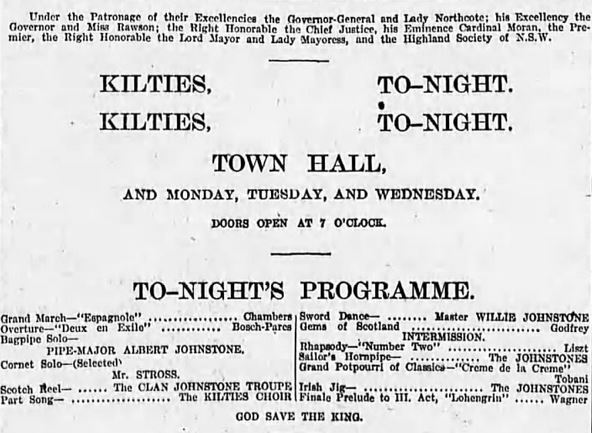 Organizing a round-the-world tour in 1908 was quite an undertaking, and Thomas Power seems to have been a genius at promoting the Kilties. The band members always wore their kilts, even when they weren't performing, and the photographs show huge Kilties posters displayed at the towns where their shows were hosted. This sign was put up in Masterton, New Zealand: