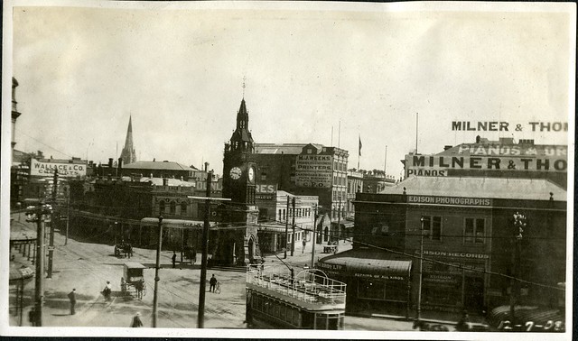 Or this image of the Victoria Clock Tower in Christchurch, New Zealand, with horses, carts, and an electric streetcar passing by: