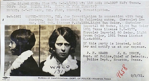 Dorothy and her husband, John were members of a gang of bank robbers. John was shot in the head by fellow gangsters on August 30th, 1931 and his body was dumped in the Brazos river near East Columbia, Texas. Two weeks later, Dorothy was killed in a car accident near Bonne Terre, Missouri.