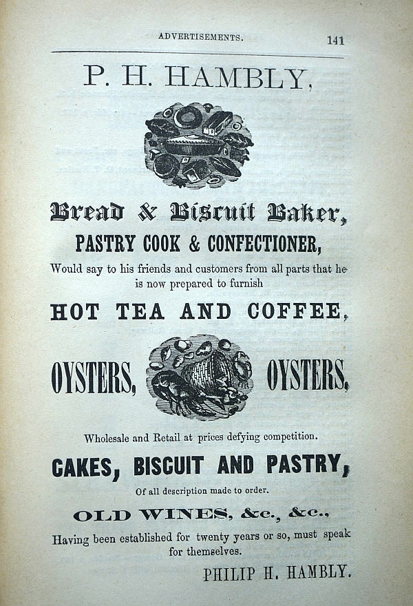 The saloon where Castree died was at 258 Front Street (later occupied by Greenley's bookstore). The advertisement for Philip Hambly's business in the 1869-1870 directory for Hastings County shows that it sold an interesting range of goods: