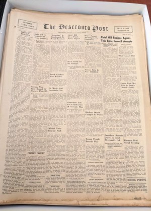The Deseronto Post was published for much of the early 1900s and its news stories covered local events in Deseronto and the Tyendinaga Mohawk Territory and sometimes further afield. The Community Archives does not have a complete run of this publication, but there are over 200 issues in our holdings, most of them on paper and some on microfilm. The paper copies are fragile and in danger of further disintegration every time they are used. One of the projects we started before the Covid-19 closure of the archives was to scan these newspapers and share them online to help protect the originals. Staff are back at work in the archives and this digitization job is now complete.