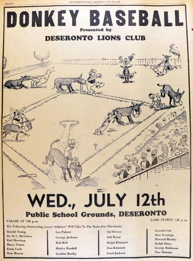 In July 1950, more than 1,000 people attended an unusual game of baseball in the grounds of Deseronto Public School. Local businessmen and officials took part in a game of Donkey Baseball to raise funds for the Lions Club Memorial Park. The event was reported on in the town’s newspaper of the time, The Deseronto Post on 19 July. (Spoiler: it was not a high-scoring game.)
