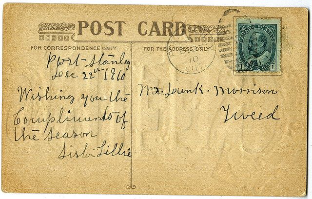 In the meantime, I would like to wish you a peaceful and happy holiday season and leave you with this postcard, sent by 'sister Lillie' of Port Stanley to Duncan Morrison of Tweed in December 1910.