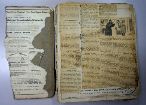 In between Alice's pastings, we can see some of the text of Nathan Richardson's book. This was the key to re-creating Alice's original order. Some of the pages still had visible page numbers, although most did not, but the majority had at least some words and phrases. The book has been digitized by the University of North Carolina at Chapel Hill and is available online through the Internet Archive. This digital copy has proved extremely useful in discovering the original order of the scrapbook. Using the Internet Archives' searching facility, we were able to locate the identifiable words and match them to the page numbers of the original book. Once all the pages were identified, it was a simple matter to put them into the order they would have been in when the book was intact.
