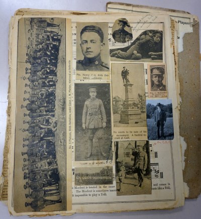 A recent accession (2015-55) presented something of a puzzle in this respect. It is a scrapbook from the First World War, of newspaper clippings and other memorabilia which had been pasted into a printed book. The binding of the book had partially come apart and the early pages of the scrapbook had been jumbled into no particular order, with clippings dated 1917 mixed with those from 1916.