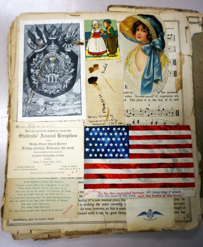 Here we find an invitation, two pressed flowers "from ruins of a French village, May 1917" and a picture labelled "off a box of chocolates Jim gave me for my birthday, 1916".