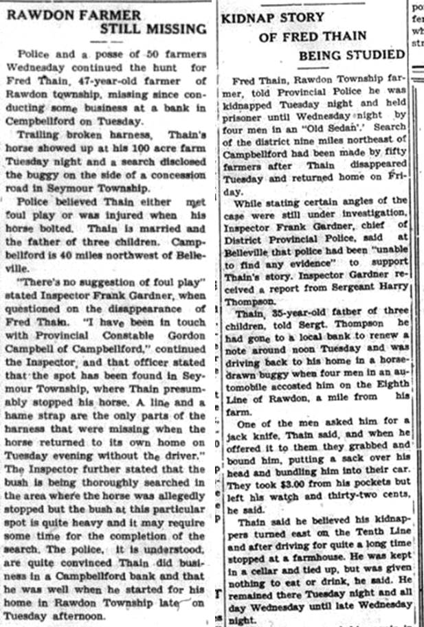 Fred Thain, Rawdon Township farmer, told Provincial Police he was kidnapped Tuesday night and held prisoner until Wednesday night by four men in an “Old Sedan.” Search of the district nine miles northeast of Campbellford had been made by fifty farmers after Thain disappeared Tuesday and returned home on Friday.