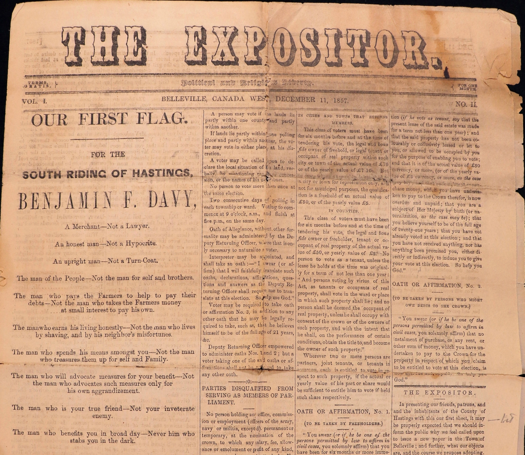 One of the major Community Archives projects of 2020 has been the digitization of some of the newspapers in the collection. These range from titles where only a single issue survives, such as The Expositor of 11 December 1857, pictured here, to long runs of newspapers such as The Weekly Ontario and Bay of Quinte Chronicle. This publication was in existence from 1841 to 1930, when its owner at the time, William Herbert Morton, bought The Intelligencer and the two newspapers merged.
