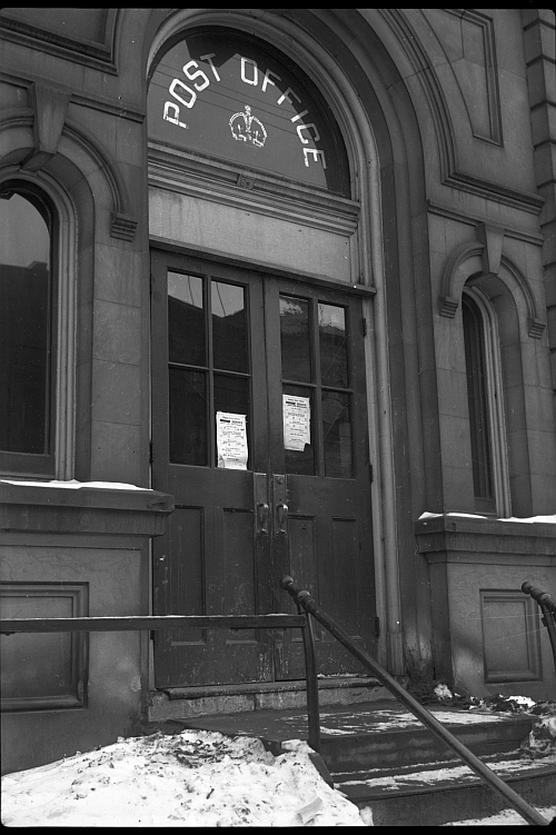 The image does not show the words 'Post Office' above the door. However, another negative in this group does show the text and also two white notices on the door:
