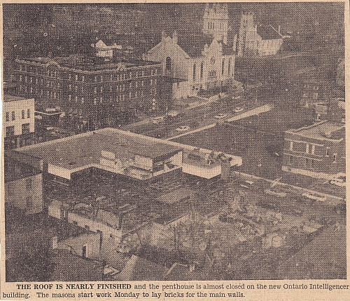 This photograph in the newspaper for 7th November 1964, taken from City Hall, shows the new building under construction, with the Quinte Hotel in the background.