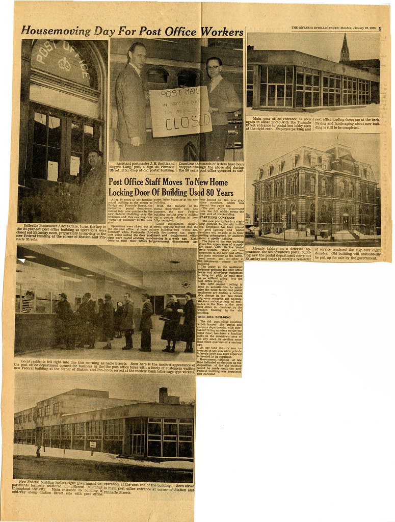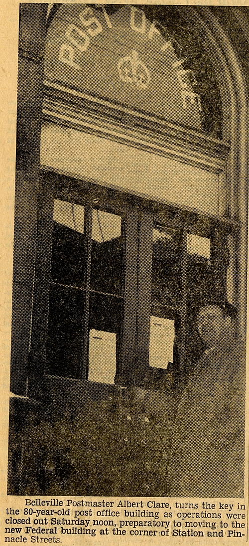 On 25th Janaury 1960 The Intelligencer covered the closure of Belleville's old Post Office, on the southwest corner of Pinnacle and Bridge streets. The building had opened to the public in 1883 and was being replaced by a new Federal building on the southeast corner of Pinnacle and Station streets.