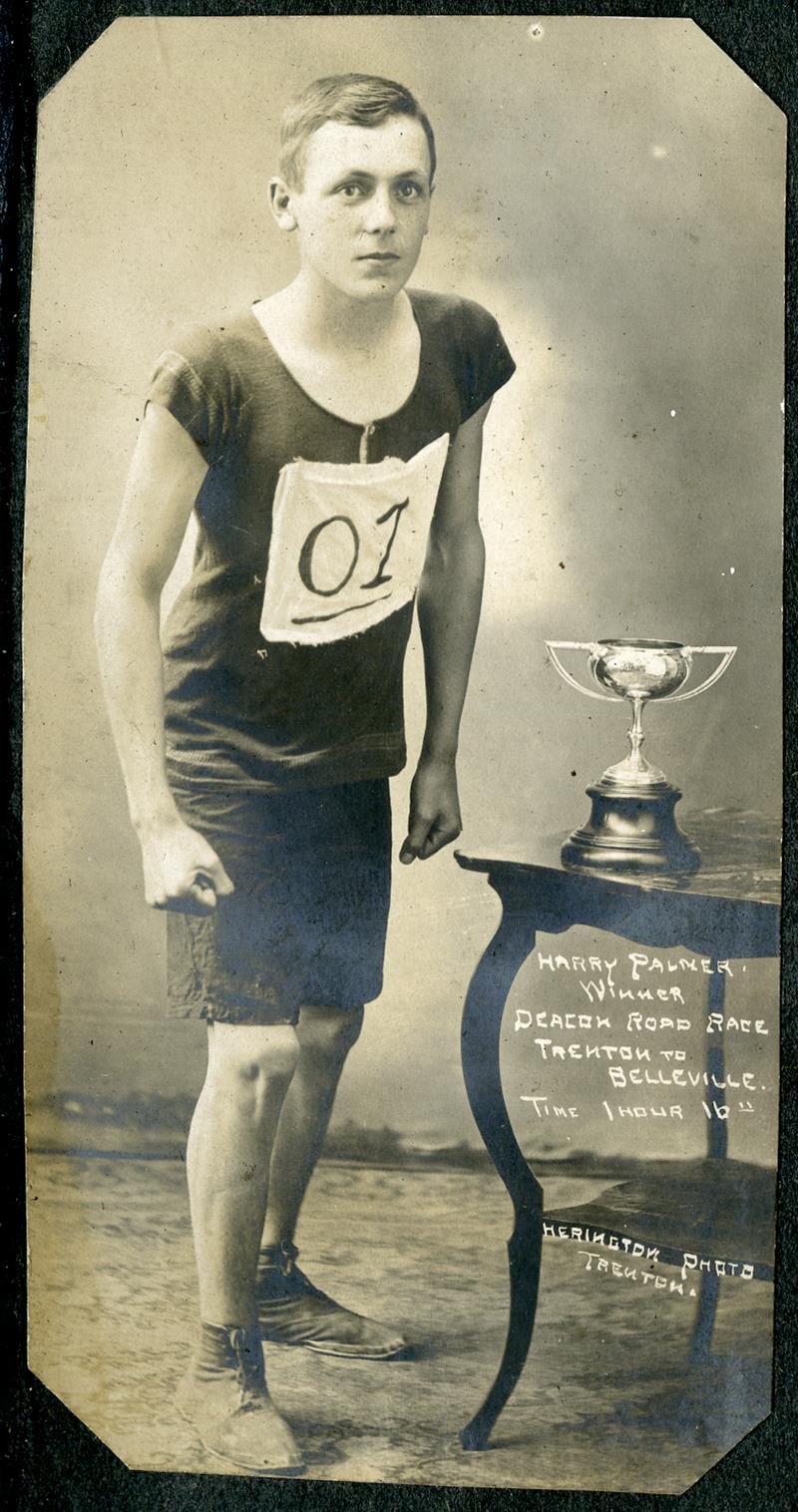 In a family album of otherwise unidentified people, was one photograph of Harry Palmer, taken by Clarence Herington of Trenton. In the picture, a young man poses in athletic clothing, a number on his chest. On the table beside him is the trophy he won by running from Trenton to Belleville in one hour and sixteen minutes.