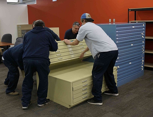 The most challenging items to move were the eight map chests: these are very large and heavy and it took nearly all the moving team to get them onto dollies and then into place in the new reading room.