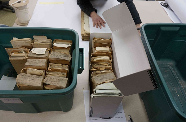 The Archives is busy with preparations for the move next month. Fragile items such as old copies of The Intelligencer newspaper are being wrapped to protect them, while other records such as the Hastings County records in the picture below are being rehoused in archival-quality boxes which will fit on the shelves of our new space.