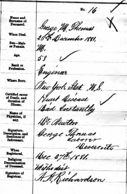 George Thomas died suddenly in Deseronto on 25 December 1881, leaving his wife, Hannah, and their three children to survive him.