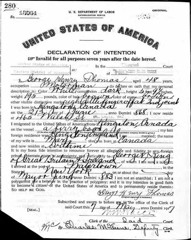 At the time of the 1891 census, the younger George Thomas was working as a labourer in the Rathbun Company's sawmill in Deseronto. In that year he married Mary Elizabeth (Lizzie) Ackerman (formerly Moore) in Picton, on 26 September. The couple were still in Deseronto in 1901, but they left Canada for the United States in 1906 and in 1910 George was working as a motorman on the street railway in St. Louis, Missouri. In 1917 George filled out a Declaration of Intention form to become a citizen of the United States. It is interesting that he described himself as White, and that he was missing part of a finger on his right hand: presumably as a result of his time in the sawmill!