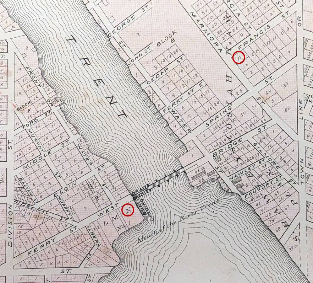 It is not clear when Charles died, or what happened to the rest of his family after their move to Trenton. In the 1881 assessment roll for the town, George Wilson is listed as the occupier of lot 17 on the north side of Marmora Street and was also the tenant of an upstairs property in block N on the south side of Ferry (now Dundas) Street which was owned by the Merchants Bank. It is likely that the barber shop was above the bank and the family lived in the Marmora Street property. The two properties are circled on the map below, taken from the 1878 Historical Atlas of Hastings and Prince Edward Counties by H. Belden & Co.