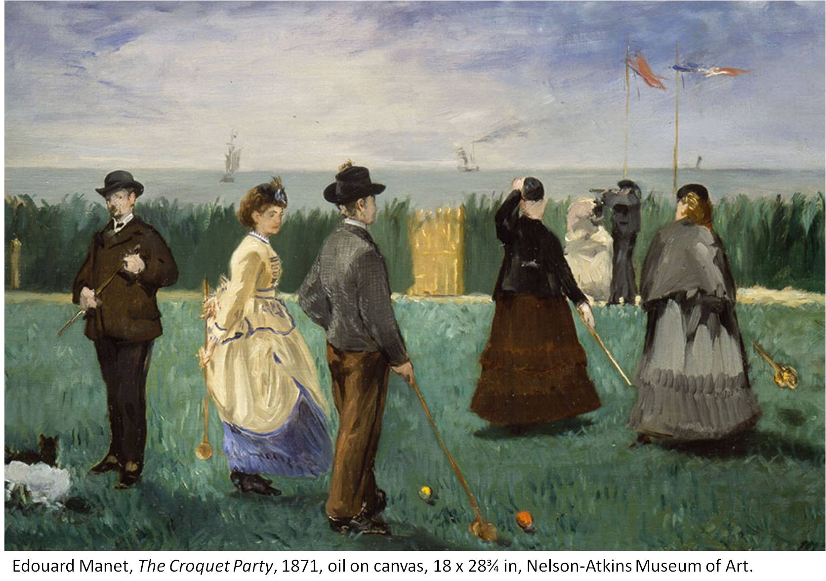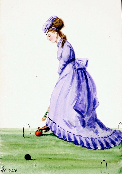 This 1869 painting depicts a woman playing croquet, wearing a light purple dress and a feathered chapeau. Croquet originated in Ireland and became a common garden party activity for Victorian men and women in the 1860s and 70s. Cartriona Parratt writes in “Academic ‘Womanhood’” that “croquet and archery were particularly suitable for women, given that they required no gross physical action,” but stresses that “both activities demanded a high degree of fine motor skill and hand-eye co-ordination” (150).