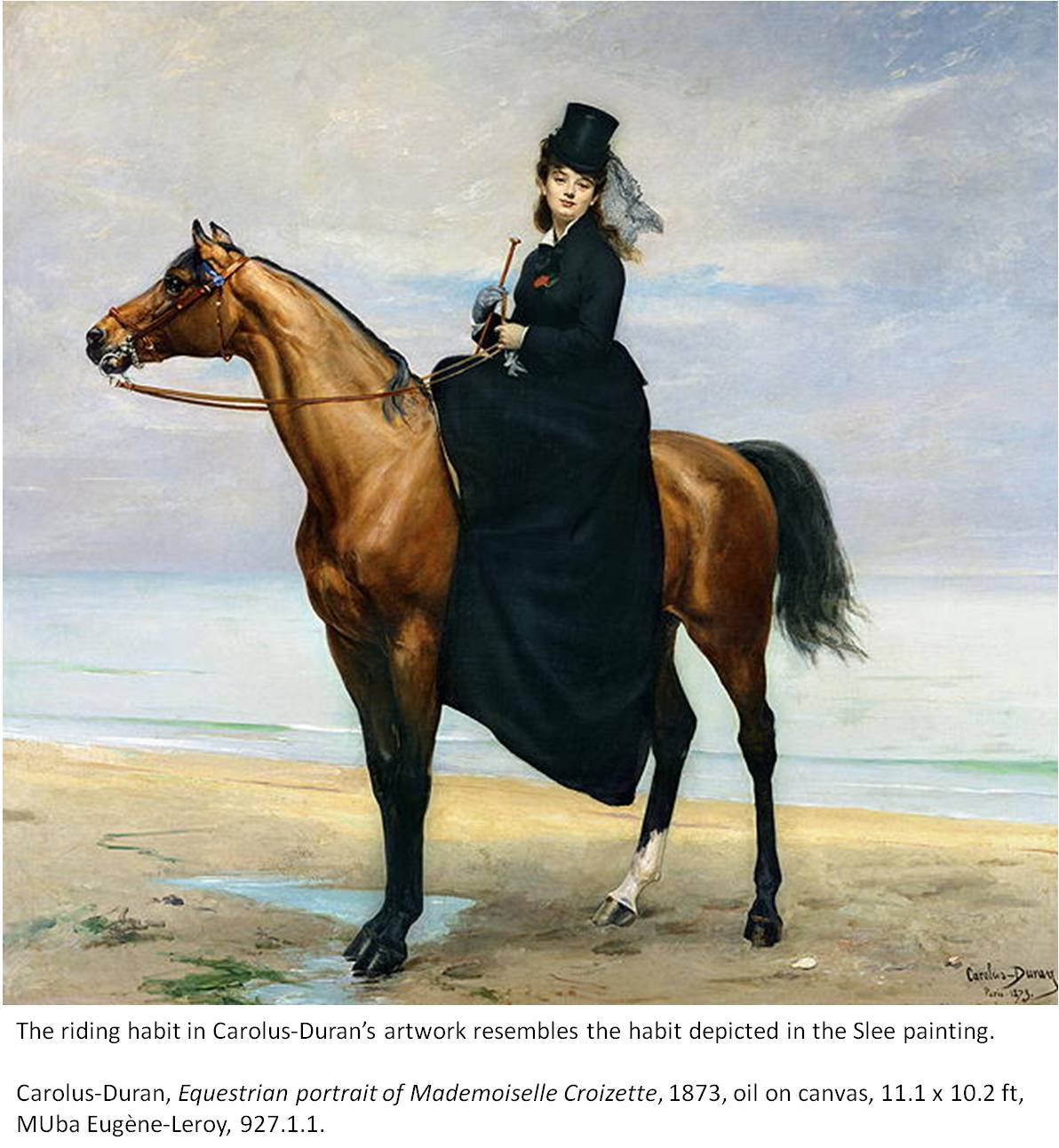 The subject is wearing a black, tailored riding habit with a veiled top hat and carries a dressage whip. As explained in an 1874 issue of The Barb and the Bridle, horse riding was considered “…as a means of recreation, as a promoter of health… [and] is perhaps unequalled among the many accomplishments necessary to a lady” (14).