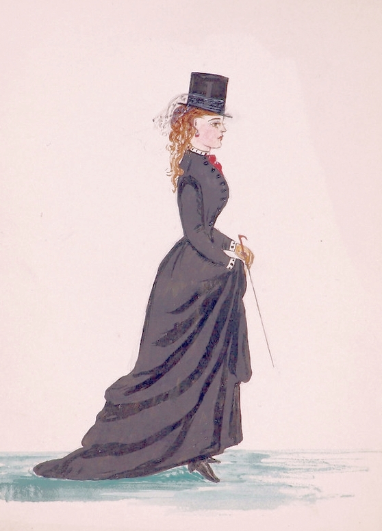 An 1865 issue of Beeton’s advises women to wear plain riding habits “usually of black or dark green woolen stuff fitting closely to the bust; the gloves should be strong buff leather, coming up well upon the wrist; the whip light and plain” (684). Women were expected to ride side-saddle and understand the fastenings of her horse in order to bridle and saddle the horse herself, if men were not present for assistance.