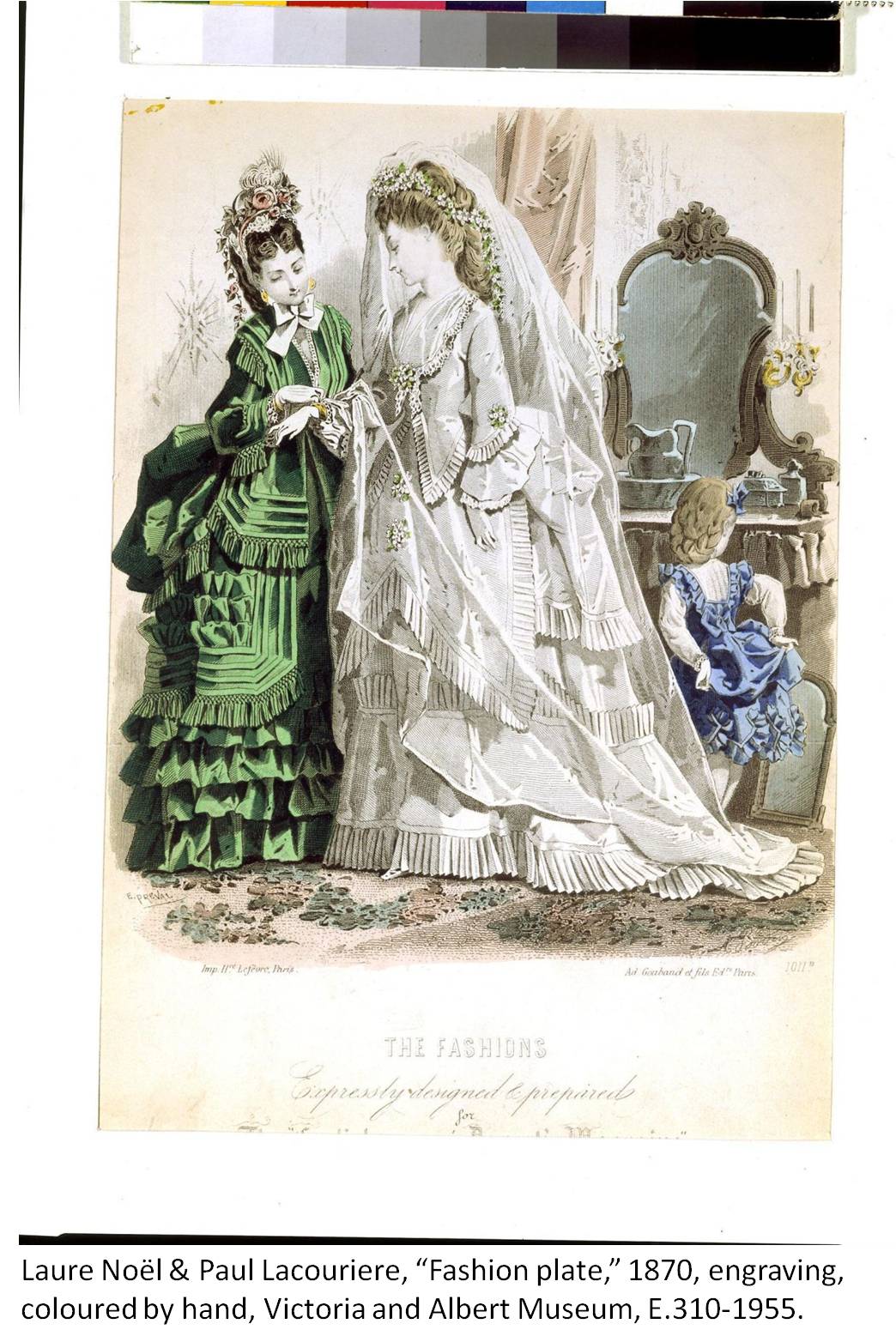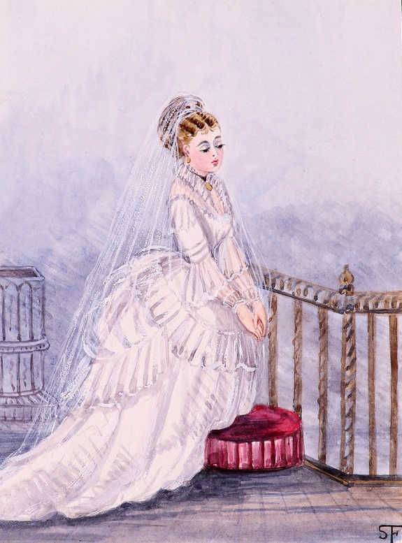 This painting by “SF” presents a bride kneeling before an altar. Popularized by Queen Victoria’s wedding dress, wealthy brides wore white or cream as a symbol of purity and refinement. Lower classes continued to wear coloured wedding dresses because they could be reused for other events.