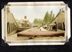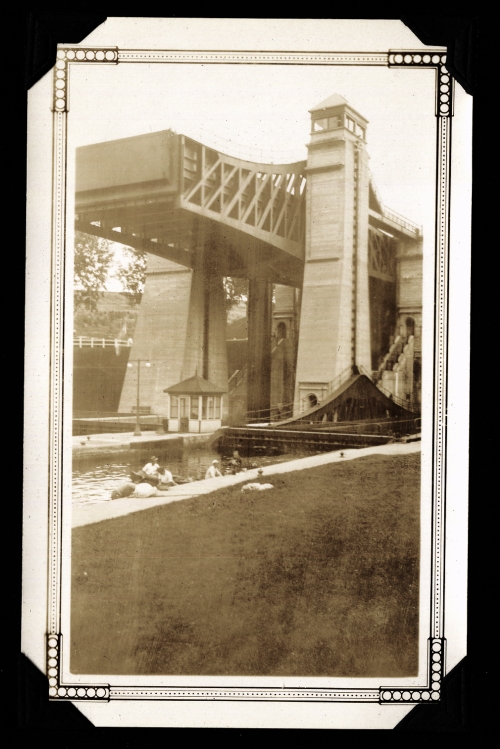 One of the lock keepers suggested that we ask the captain of the tug if we might put our canoes on the barge he was pulling. This, he suggested, would help us make better time through the locks farther up. The captain readily consented to allow us to do this, so as the lift locks raised us rapidly 65 feet, we piled our canoes and duffle on the old scow.