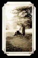 Finally we found a site near the Rotary Camp which looked as though It had possibilities. Several great boulders had to be removed and a number of fill-ins made before we got a level surface inside the tent. Meanwhile a most elegant stone fire-place was being made by the cook. I found a sloping flat stone so did some of the family wash in soft, soapy water. Jack and Bobs were trying their skill in chopping birch logs in less than nine strokes and Bob, of course, was fishing. While this hive of industry was at its buzziest, Mr. Loomis (Rotary camp director and a friend of Ralph) and Mr. and Mrs. Harry Redfern (nee Evelyn MacLaurin) came over to pay their respects.