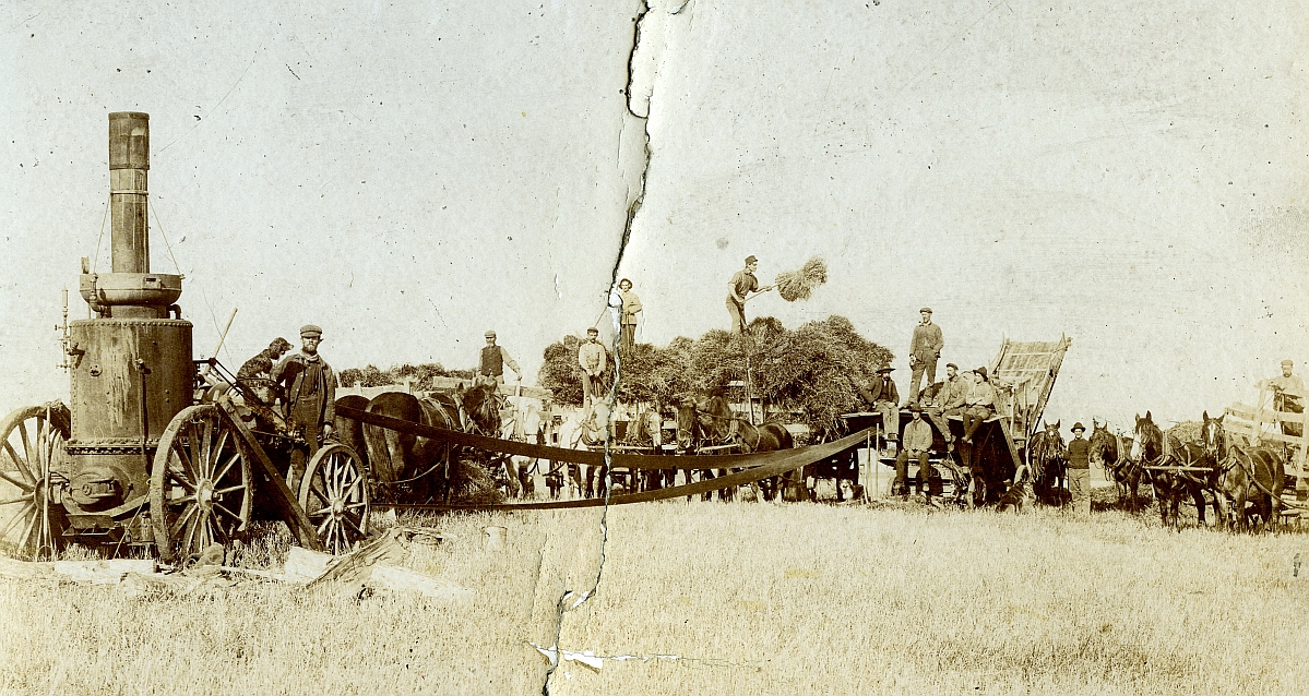 Crews like this were made up of labourers from different farms, and they would travel from farm to farm with their machine during the harvest season. If they had to stay overnight, the host farm would provide them with a hot meal.