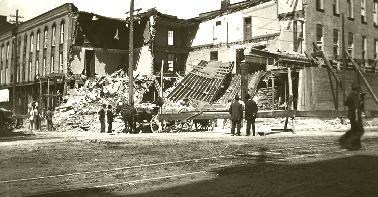 This is the scene in Belleville after the catastrophic collapse of the Ontario Business College premises at the northwest corner of Front and Bridge Streets (now the site of TD Bank) on August 28th, 1901. The tracks of the street railway are visible in the foreground.